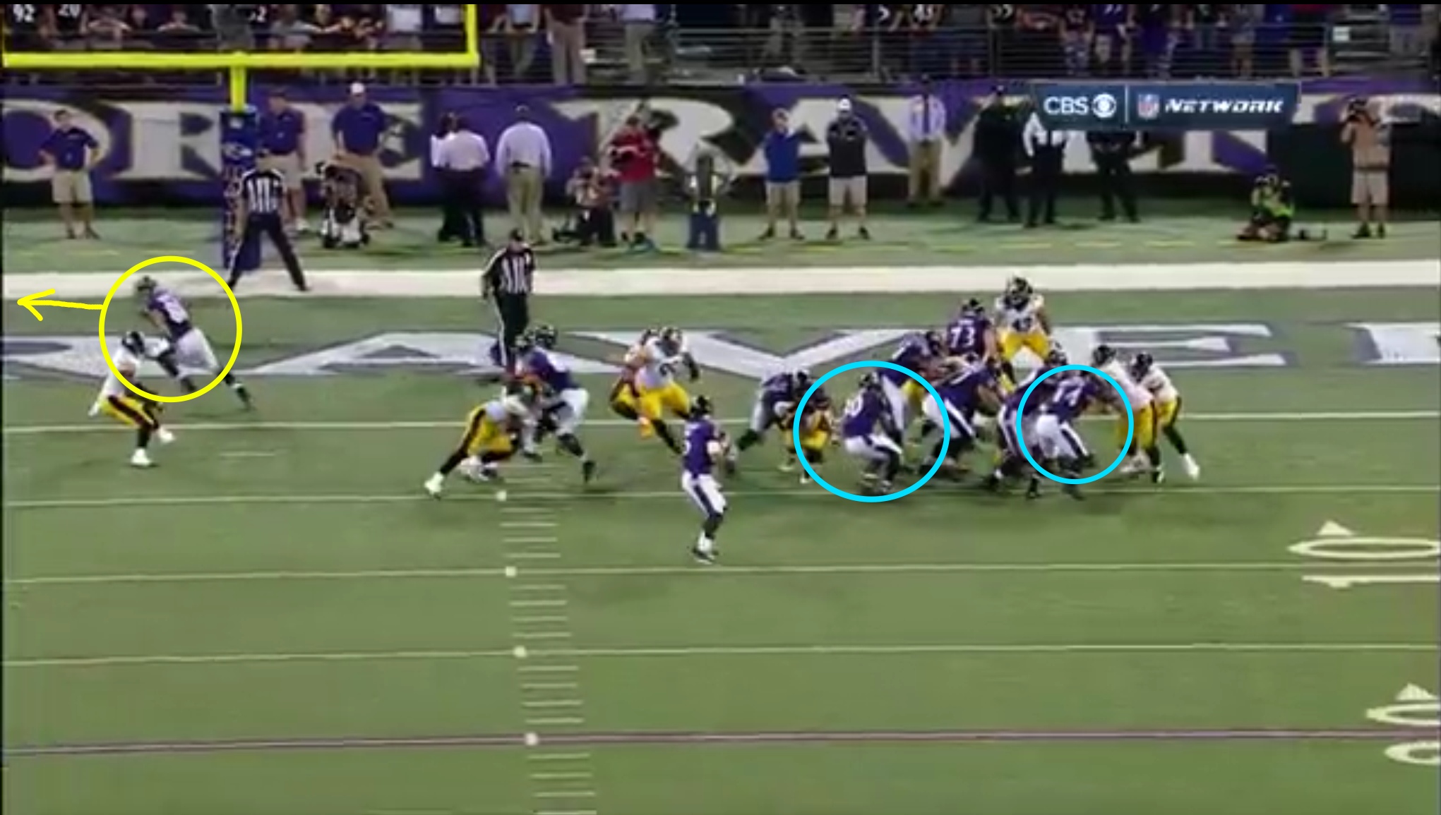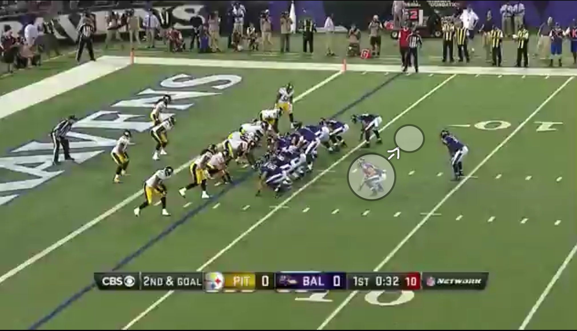 Now in an unbalance formation, the Ravens will draw most of the Steelers defense to the right with the fake to Bernard Pierce – while the lone tight end on the weak side, Owen Daniels, leaks out to the left.