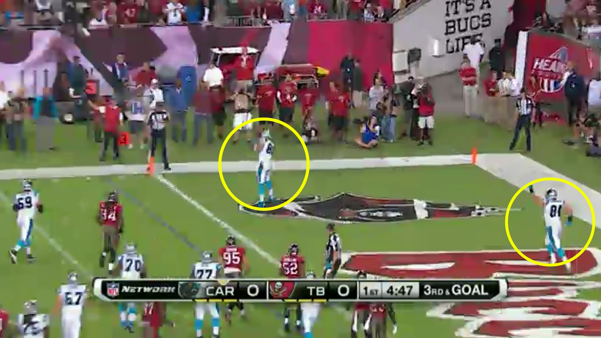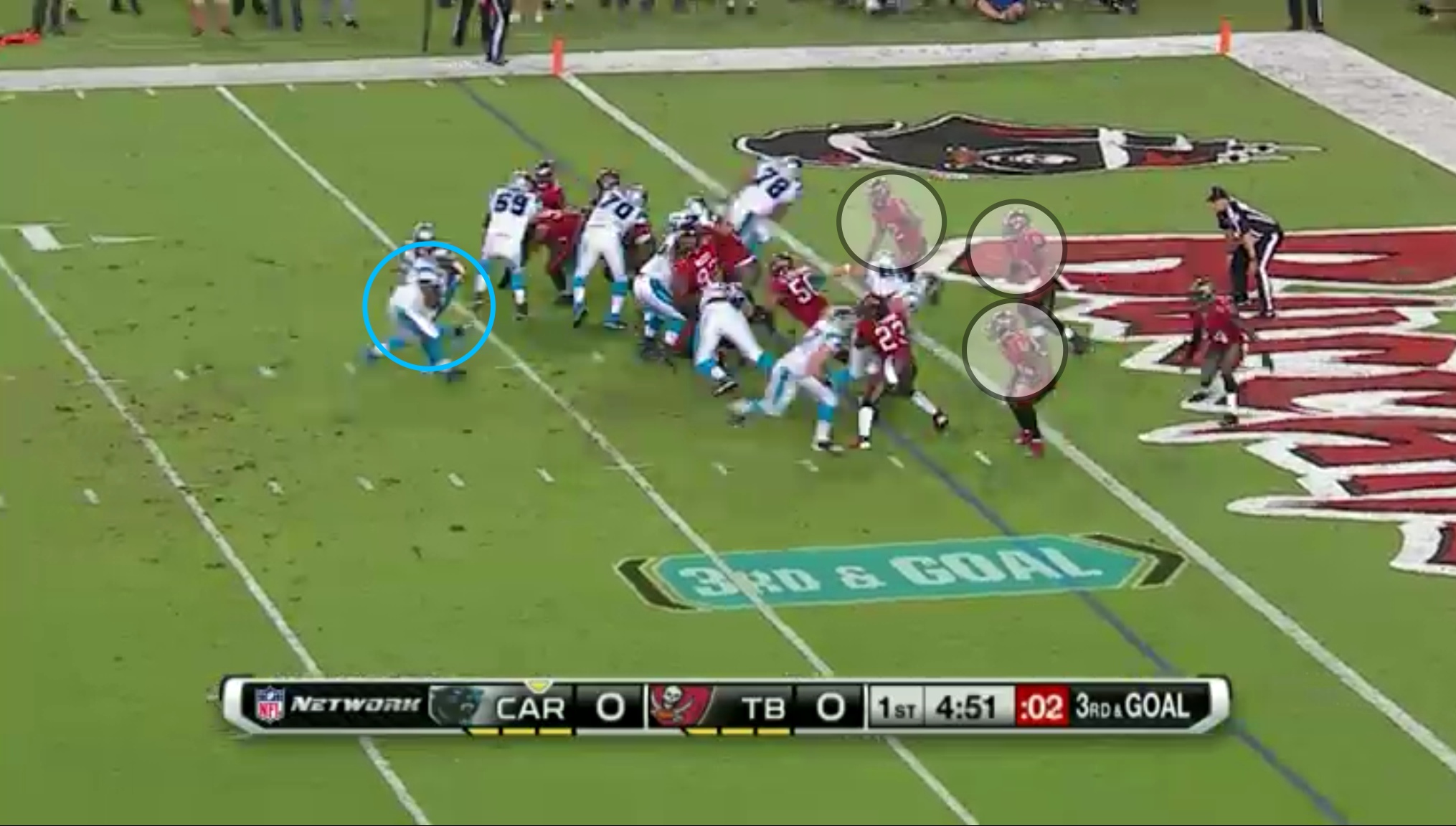 They will run a run fake to Mike Tolbert to the strong side, sending Richie Brockel out to the right flat, and keeping the entire Tampa defense pursuing to that side. Greg Olsen, the inside tight end, will leak out the the left side and find open space. Hartsock will do the same but position himself behind the linebackers who are stepping up in their run responsibility.