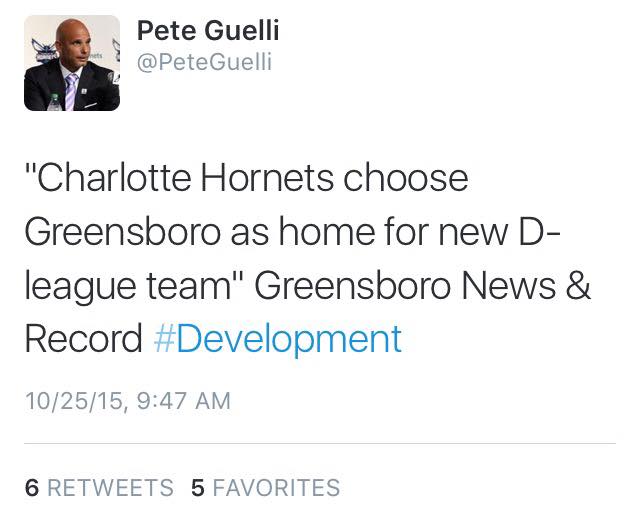 Pete Guelli, the Executive Vice President and Chief Sales and Marketing Officer for the Hornets, broke the news on twitter early Sunday morning that the Hornets had finally decided on what city they would place their D-league team. They had chosen the Greensboro out of 7 potential locations located in North and South Carolina.