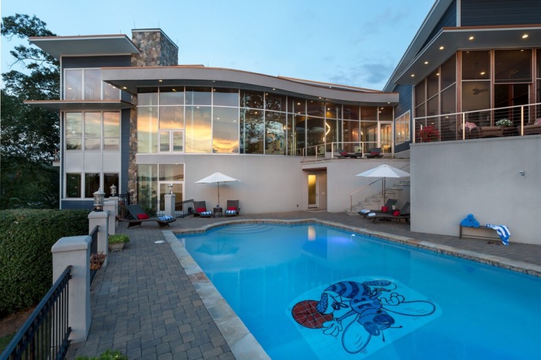 These images are from George Shinn’s old home on Lake Wylie where he had a pool designed to look like a basketball court and have the Charlotte Hornets logo in the middle.