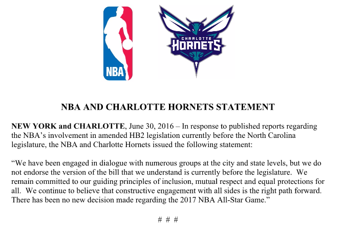 NBA Statement on HB2 June 30, 2016Scotty & Evan Share this: Click to share on X (Opens in new window) X Click to share on Facebook (Opens in new window) Facebook Like Loading... Related