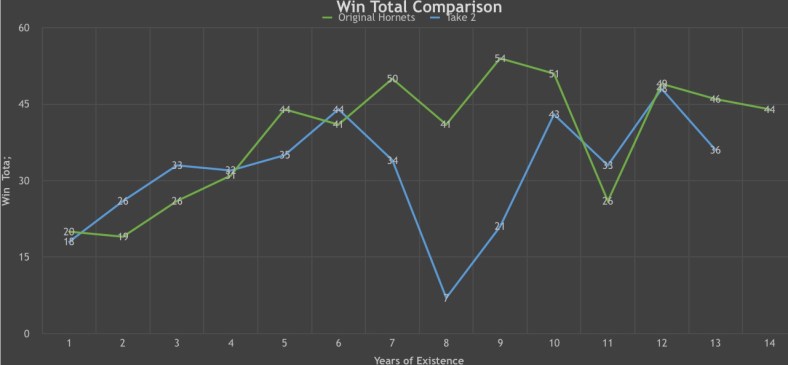 Around the 6th season the Original Hornets had established themselves, besides the 1998-99 lockout season, as a consistent mid-40 win team that you could occasionally expect to break 50 on a good year. Consistent isn’t even a word I like using in the same sentence as the “Take 2”.